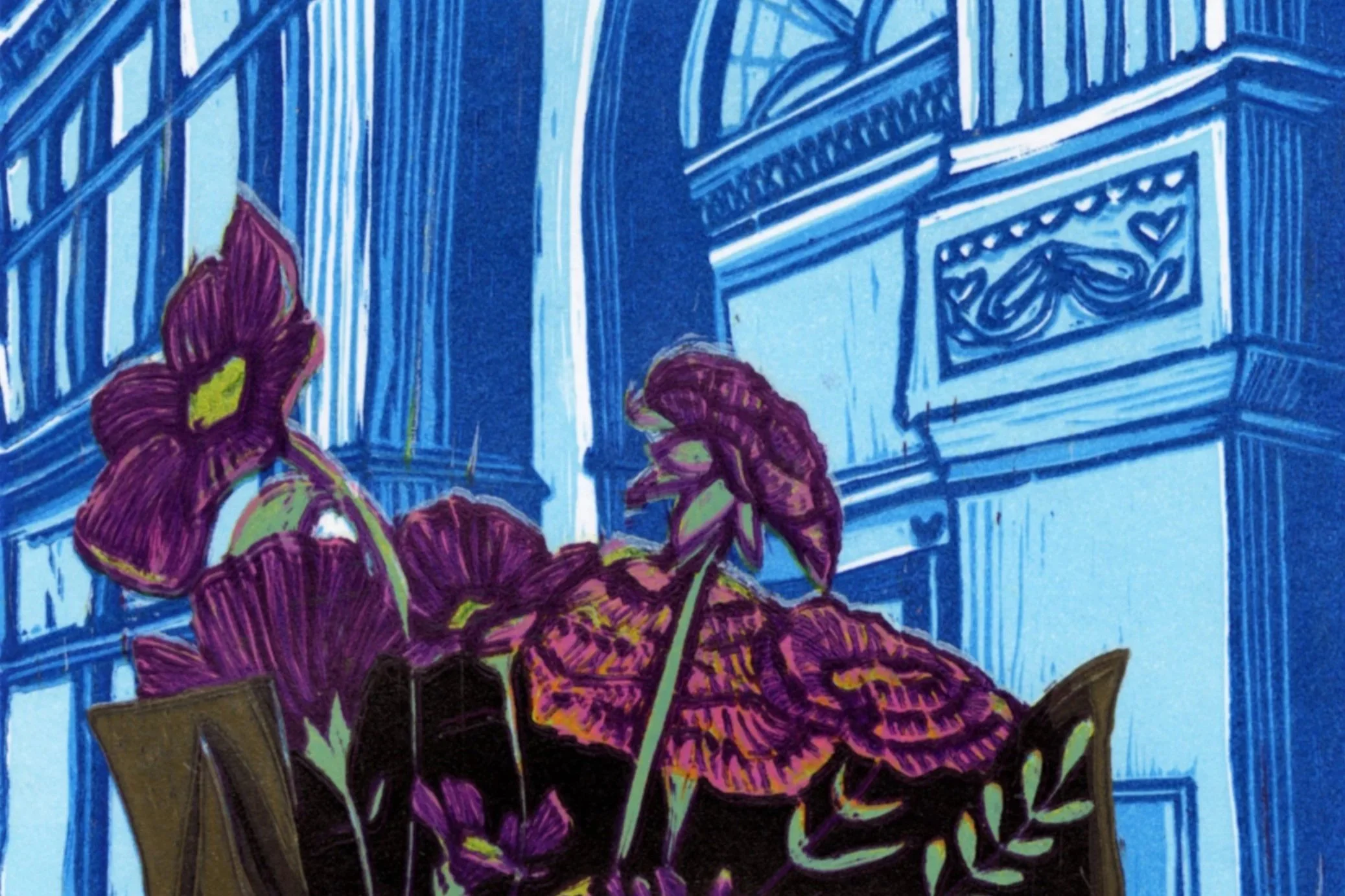 The bouquet pictured in this piece is one that I bought from a local Kansas flower farm that was vending at a downtown Wichita market, and the building in the background is the historic Eaton Hotel.
